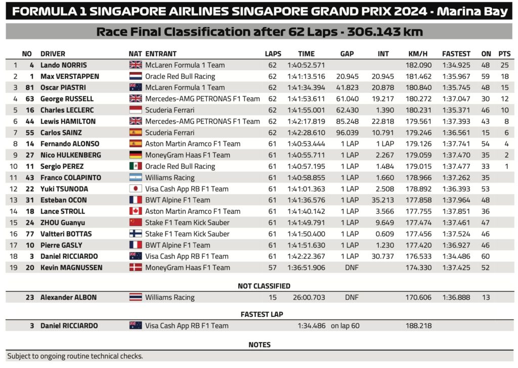 ピレリのモータースポーツ・ディレクターであるマリオ・イゾラも、今回のレースは「比較的シンプルで、1ストップ戦略が最速であることが明らかだった」と振り返っています。また、シンガポールGPでは史上初めてセーフティーカーの介入が一度もなかったことがレースの流れを安定させた要因としています。