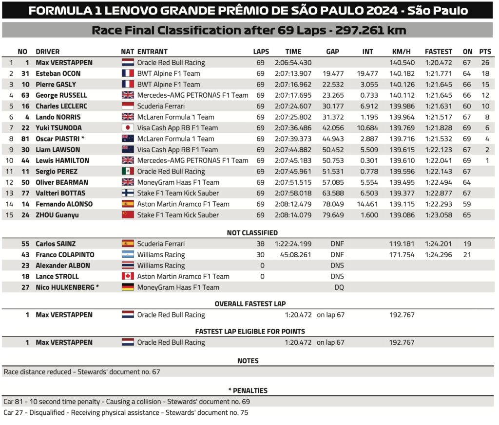 最終的に、フェルスタッペンはエステバン・オコンやピエール・ガスリーとの競り合いを制し、リードを広げてチェッカーを受けた。その圧倒的なペースは、最後の26周で毎周約0.7秒ずつリードを広げ、最終的には19.5秒の大差で勝利を収めたことからも明らかだ。「マシンのバランスがとても良くなっていた」とフェルスタッペンは振り返り、その自信が圧倒的なペースにつながった。彼のファステストラップの記録は、レース中に17回も更新され、そのうち14回はリードを奪った後に達成したものであった。「レース中、どんどんマシンが良くなっていくのを感じた。特に最後のセクターでは圧倒的だった」と彼は述べている。