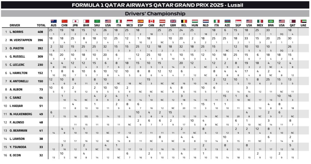 カタールGPは、マクラーレンの判断ミスが注目を浴びたレースであり、ノリスの揺らぎが隠された週末でもあった。しかしその裏側では、ピアストリの復活とフェルスタッペンの冷徹な躍進が静かに物語を動かし、アブダビへ向かう緊張感を高めている。今年のタイトルは、最後の最後まで簡単には決まらない。むしろ、ここからが本当のクライマックスなのだ。