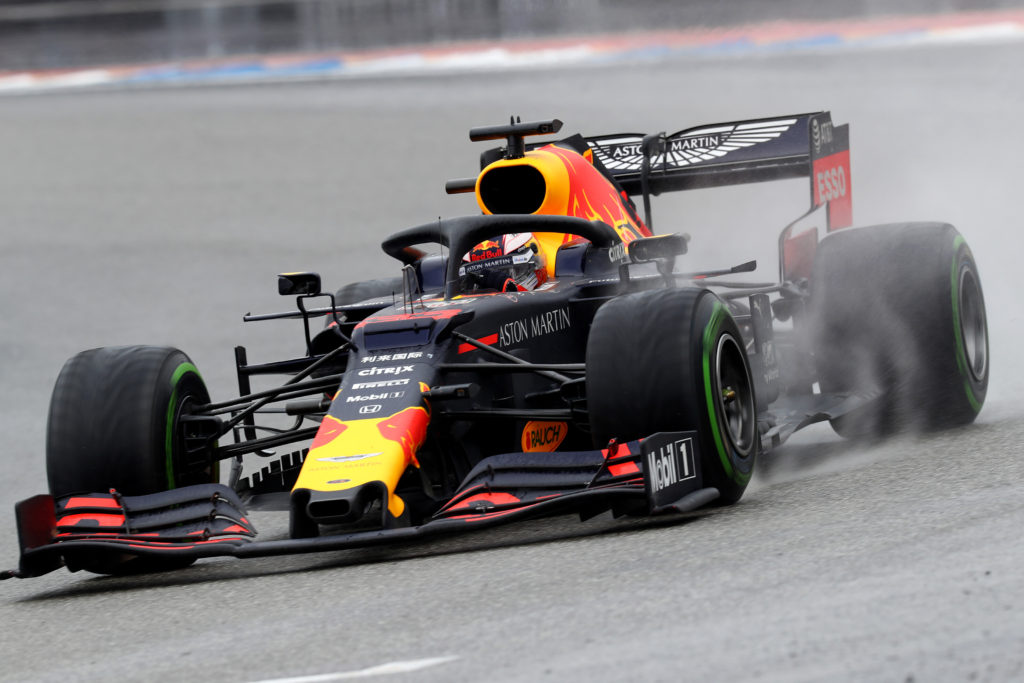 まず予選二位のフェルスタッペンがスタートでホイールスピンして四位に落ちます。これはエンジンのマッピングが濡れた路面に最適化されてなかったようです。つまり路面が濡れていたのに、スタート用のマッピングが想定よりもパワーが出るように設定されていたのでしょう。